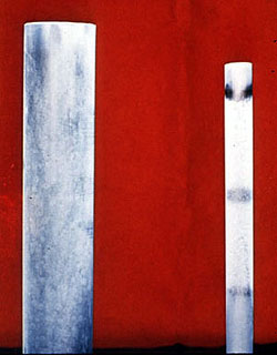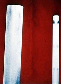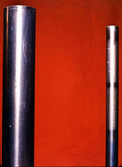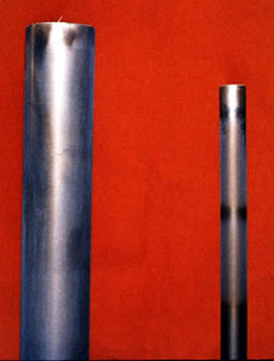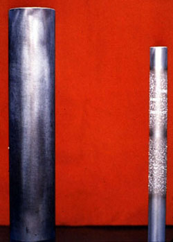 As with phosphate precipitation and chelant control programs, the use of these polymers with coordinated phosphate/pH treatment improves deposit control. Figure 12-14 illustrates the effectiveness of dispersants in controlling iron oxide deposition. Test conditions were 1500 psig (590°F), 240,000 Btu/ft²/hr heat flux, and coordinated phosphate/pH program water chemistry. A comparison of the untreated heat transfer surface (shown at left) with the polymer dispersant treated conditions (shown at right) provides a graphic illustration of the value of dispersants in preventing steam generator deposition. The ability to reduce iron oxide accumulations is an important requirement in the treatment of boiler systems operating at high pressures and with high-purity feedwater.