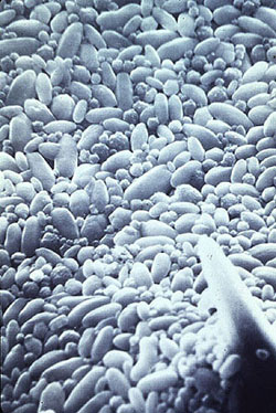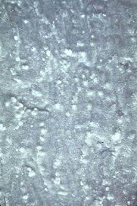 Figure 12-14. Experimental boiler heat transfer suraces (800X magnifications) exposed to feedwater iron contamination. Heavy iron oxide deposition occurred (left) when no polymer was used. A virtually clean surace was achieved with an iron-specific polymer program (right).