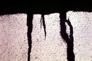 Some intercrystalline cracking may develop in this type of failure whether or not free NaOH is present. However, the predominant type of cracking is across the grain structure of the metal. Because it is mechanically induced, the cracking occurs irrespective of boiler water chemical concentrations. The cracks are often accompanied by a number of pits adjacent to or in line with the cracking- another specific indicator of the mechanical stresses imposed. Any corrosives present contribute to the formation of the pits. The normal reaction between iron and water is sufficient to cause pitting at breaks in the thin oxide film formed on freshly exposed surfaces under stress.